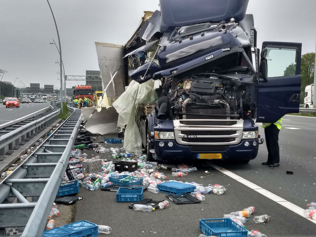De snelweg A2 is zondagnacht rond 0400 uur tussen Hedel en Zaltbommel volledig afgesloten na een fikse vrachtwagenbrand en een ongeluk dat daarna plaatsvond. Verkeer richting Eindhoven wordt omgeleid via de A65 en de A2. Op de beelden is te zien dat de middenberm bezaaid ligt met de flesjes bier.